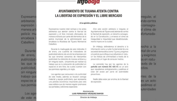 La alcaldesa de Tijuana, Montserrat Caballero, está cometiendo un atentado contra la libertad de expresión, contra el derecho a la información de la población, y un ataque directo a la propiedad privada, acusó Luis Fernando Vázquez Bayod, director de Infobaja.